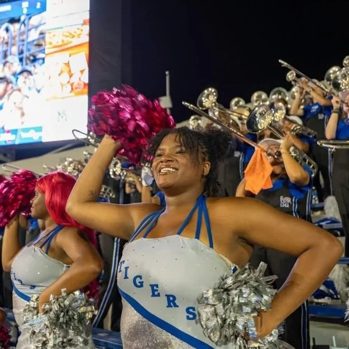 The Memphis Colorguard is part of the University of Memphis’ band program, the Mighty Sound of the South! The colorguard performs alongside the band at every football game, fiercely cheering on our Tigrs to victory. After the fall season ends, our group continues to perform in more competitive environments as the Memphis Winterguard!